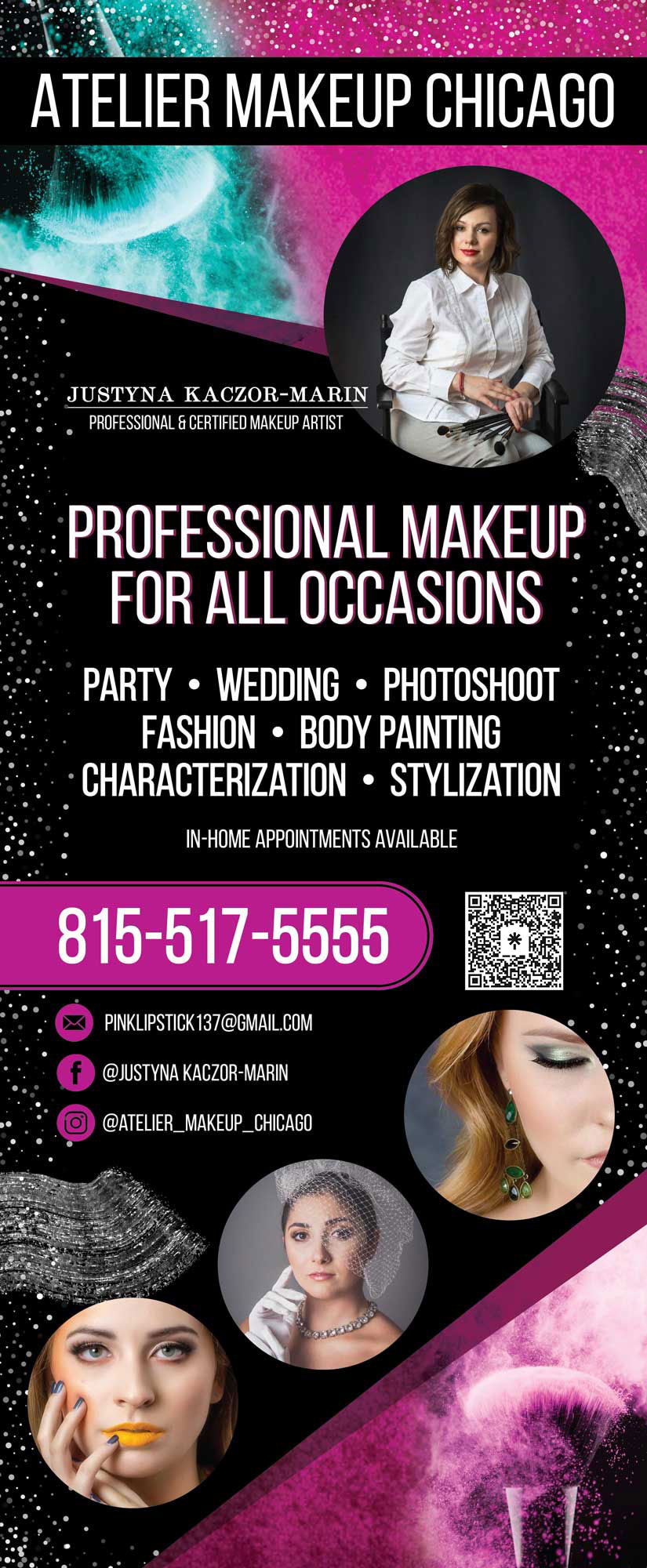Atelier Makeup Chicago oferuje profesjonalne usługi makijażu na każdą okazję, prowadzone przez certyfikowaną makijażystkę Justynę Kaczor-Marin, absolwentkę Francuskiej Szkoły Wizażu, Stylizacji i Charakteryzacji w Krakowie.