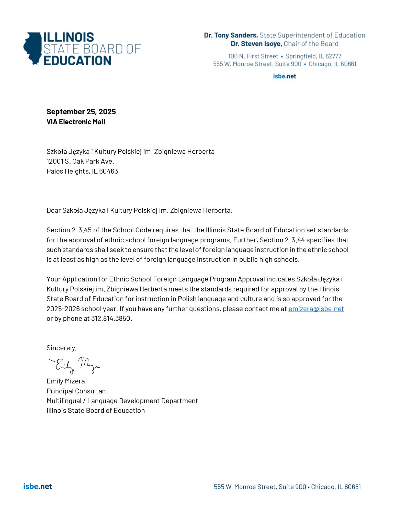 Rada Edukacji stanu Illinois (Illinois State Board of Education) przedłużyła swoja akredytację dla Szkoły im. Herberta na nauczanie w roku szkolny 2025/2026.