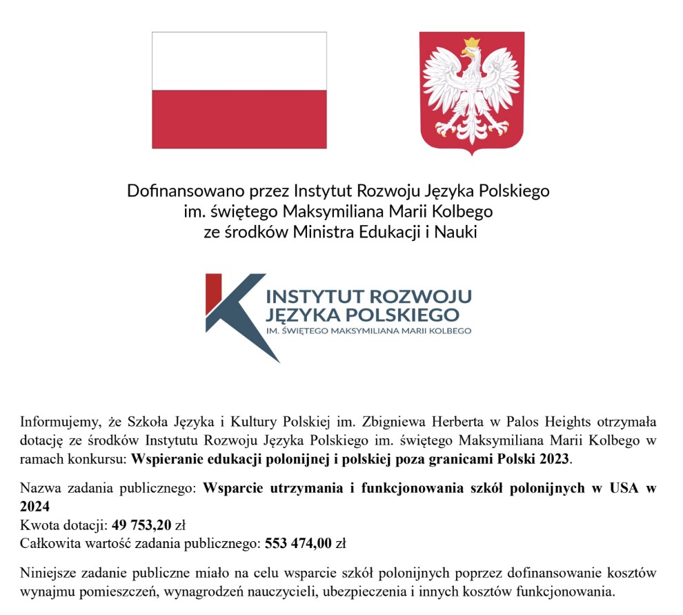 Informujemy, że Szkoła Języka i Kultury Polskiej im. Zbigniewa Herberta w Palos Heights otrzymała dotację ze środków Instytutu Rozwoju Języka Polskiego im. świętego Maksymiliana Marii Kolbego w ramach konkursu: Wspieranie edukacji polonijnej i polskiej poza granicami Polski 2023.